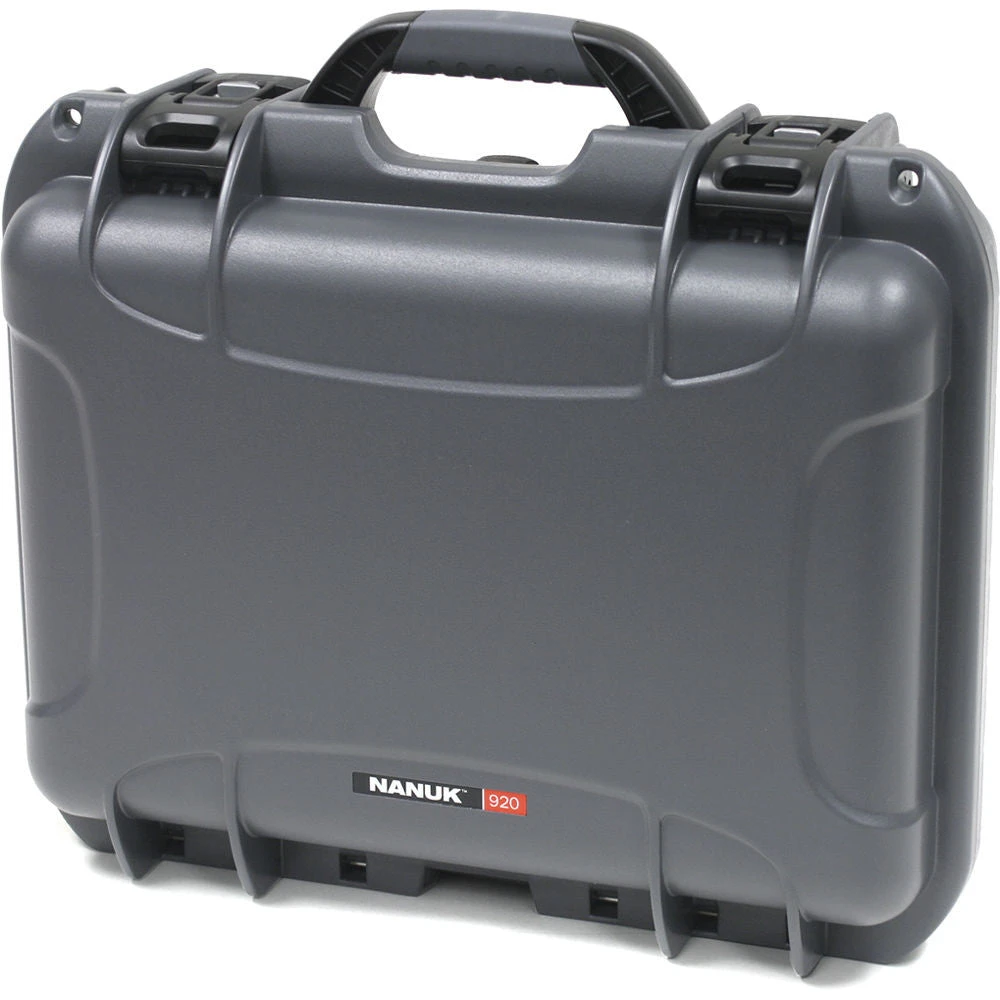 Store, protect, and transport your valuable photo, electronic, or other gear with the waterproof and dustproof, graphite 920 Case with Padded Dividers from NANUK . The case features a removable padded insert with touch-fastening dividers, and a foam piece for the inner lid. PowerClaw latches and holes for optional user-supplied padlocks provide secure closure. Users will appreciate the strong NK-7 resin construction, automatic pressure release valve, integrated lid stay, and large, folding, soft-grip handle. The 920 case is stackable with same-size cases.