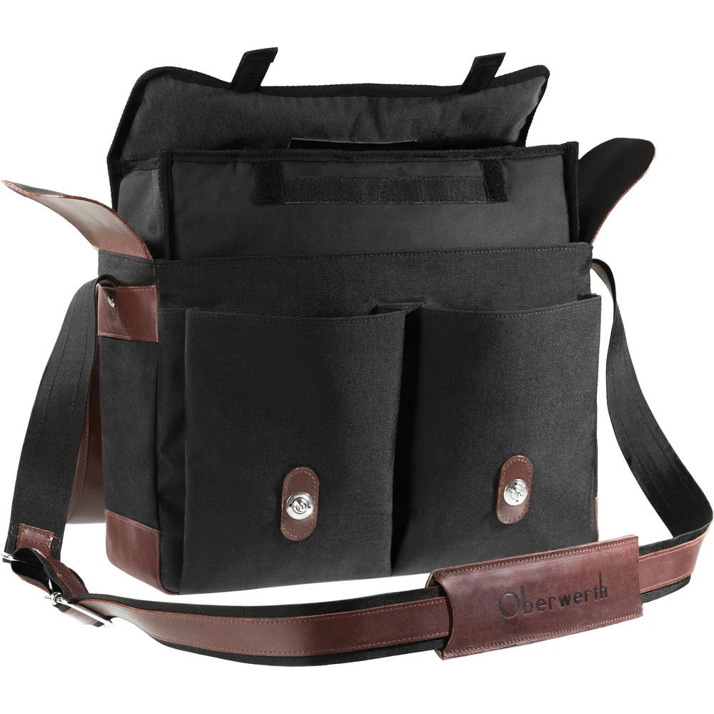 Complement, transport, and store your high-end camera gear in the style-centric Munchen Large Camera Bag from Oberwerth . This bag features a black Cordura exterior with dark brown leather flap and accents. Included inside the bag is a removable padded insert that features two adjustable, touch-fastening dividers. The insert can hold a midsize DSLR with attached lens, an extra lens, 70-200mm f/2.8 zoom, and speedlight. Between the insert and inner compartment is room for up to a 13″ laptop.
