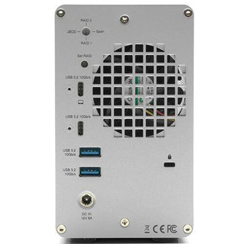 Connect to accessories using a USB 3.2 Gen 2 Type-C and two Type-A ports. A 60mm cooling fan ensures adequate thermal offloading, while a Kensington Lock slot can be used to secure the array. The Mercury Elite Pro Dual supports 2.5 and 3.5″ drives and is bootable in macOS. Supported operating systems include Windows, macOS, Linux, Chrome OS, and iPadOS.