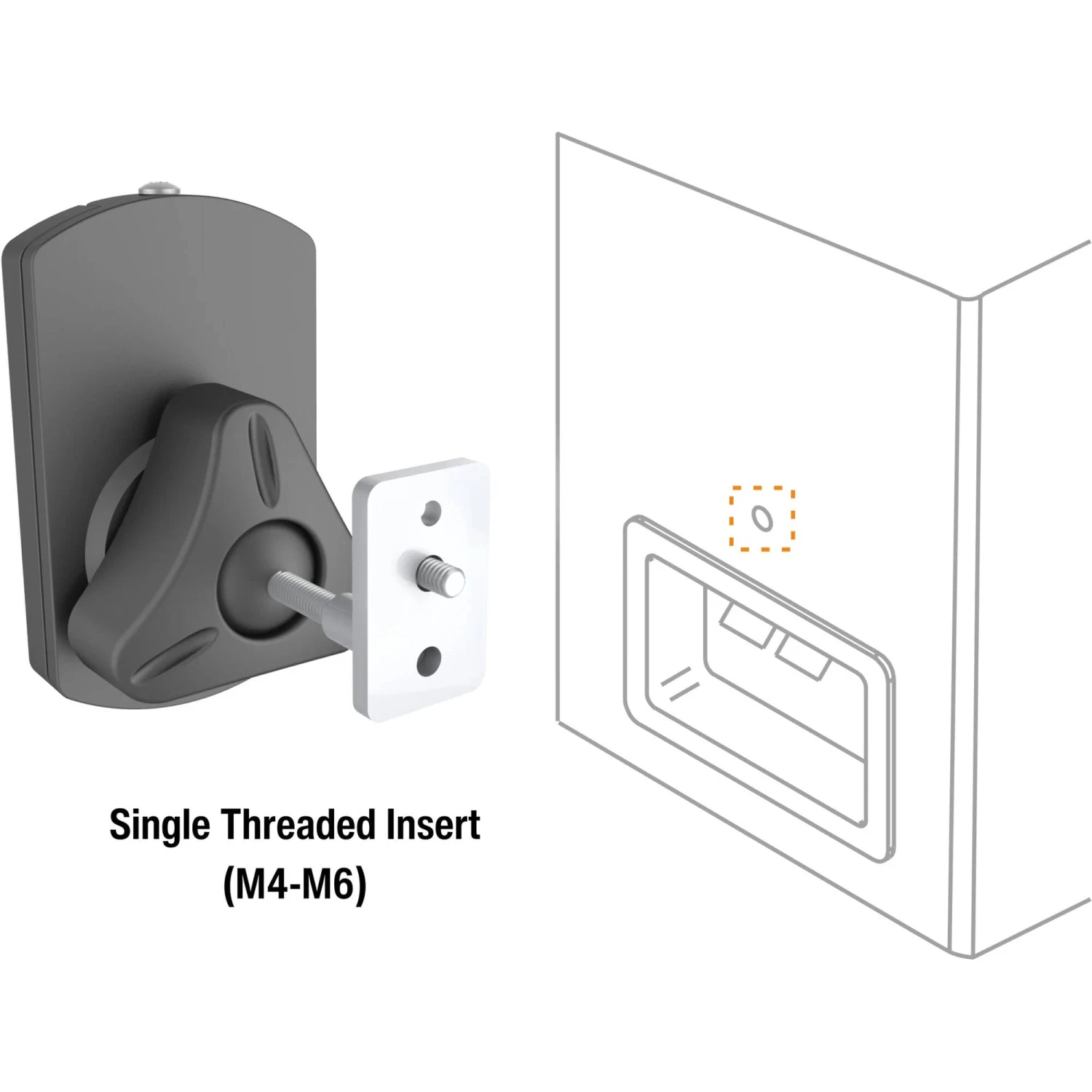 Mount a pair of indoor speakers with the Universal Swivel Speaker Wall Mount from Peerless-AV, available here in a pair. These indoor mounts support mounting to multiple wall types including wood, concrete, cinder block, or drywall. Enjoy flexible threaded insert compatibility with single threaded 1/4″-20 or M4 to M6, their double threaded variations, and keyhole M6. Find an optimal speaker position thanks to ±30° tilt, swivel, and 360° rotation with the ball-and-socket joint. The wall plate covers the mounting hardware for a clean setup. Each mount has a weight capacity of 22 lb.