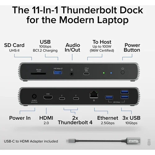 For MacBook users, Microsoft Surface devices, and other Thunderbolt 4 equipped laptops, the Plugable Thunderbolt 4 Docking Station offers plug-and-play connection supporting up to two monitors. Using the included Thunderbolt 4 cable, connect this dock to your device while keeping your notebook charged thanks to the 96W of power delivery and included AC adapter and power cord. Thanks to the two Kensington locks, you can keep this dock in place or display it worry-free.