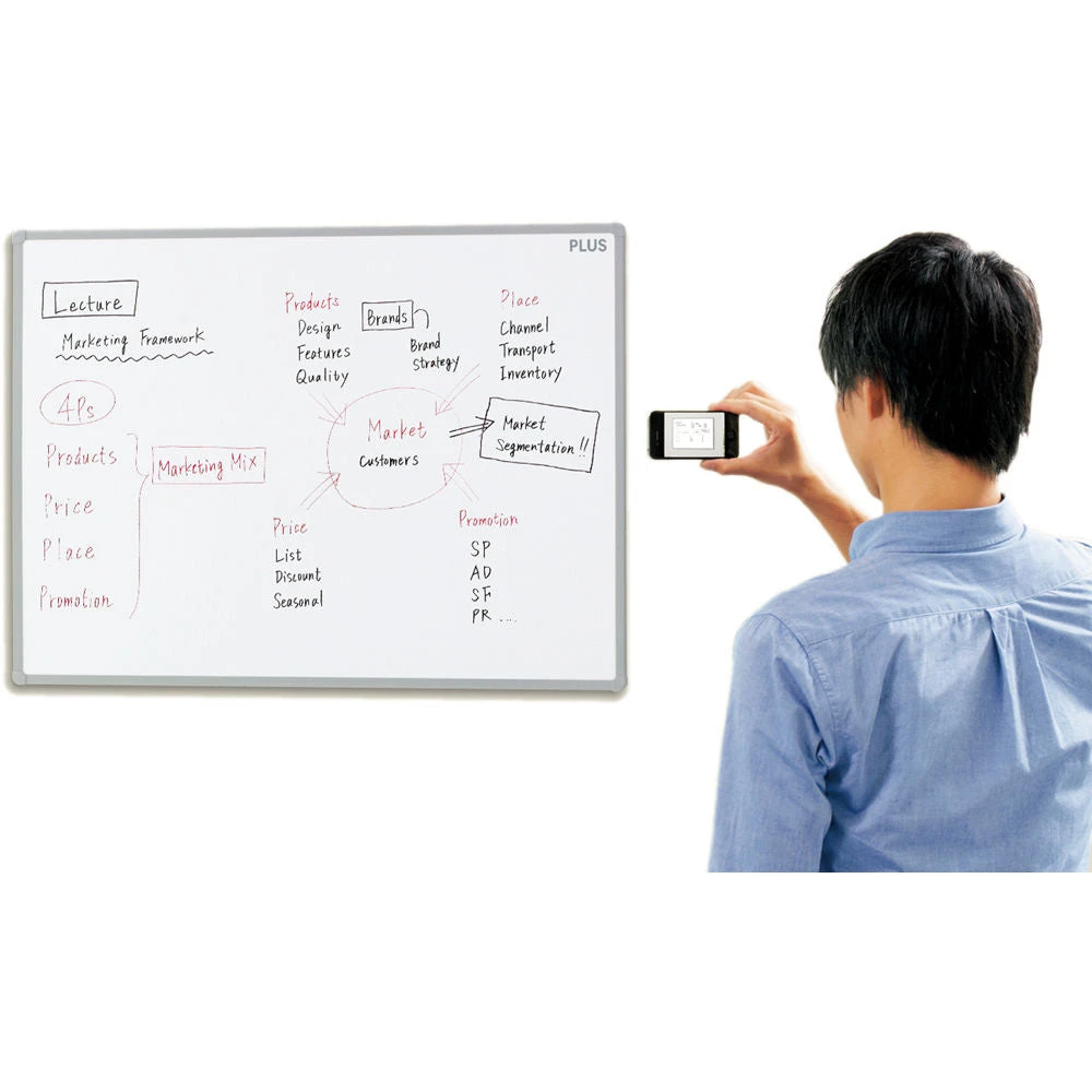 The SWB-1209SW MTG Sync Smartphone Ready Whiteboard from Plus is optimized to work with the MTG Sync App for iOS and Android devices. While using this App, simply take a snapshot of the whiteboard and an image is automatically corrected for keystone distortion using the frame recognition technology. The notes on the board are saved in a clearly readable portable size and can be easily organized and shared.