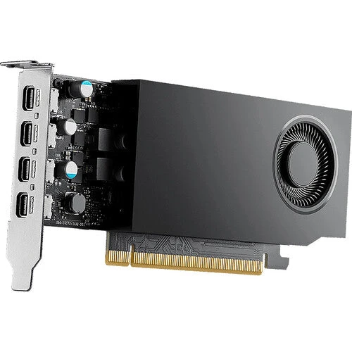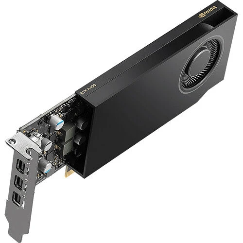 Bring the power of AI and ray-tracing acceleration into the hands of professionals with the PNY NVIDIA RTX A400 Graphics Card. Its single-slot design allows this graphics card to fit in most workstations. This graphics card features 4GB of GDDR6 VRAM. The front panel of the card features four Mini DisplayPort 1.4 outputs and can support up to four 5K displays natively. Computationally intensive programs can utilize the 768 CUDA cores to accelerate tasks using CUDA or other APIs. The card features a blower-style fan cooler.