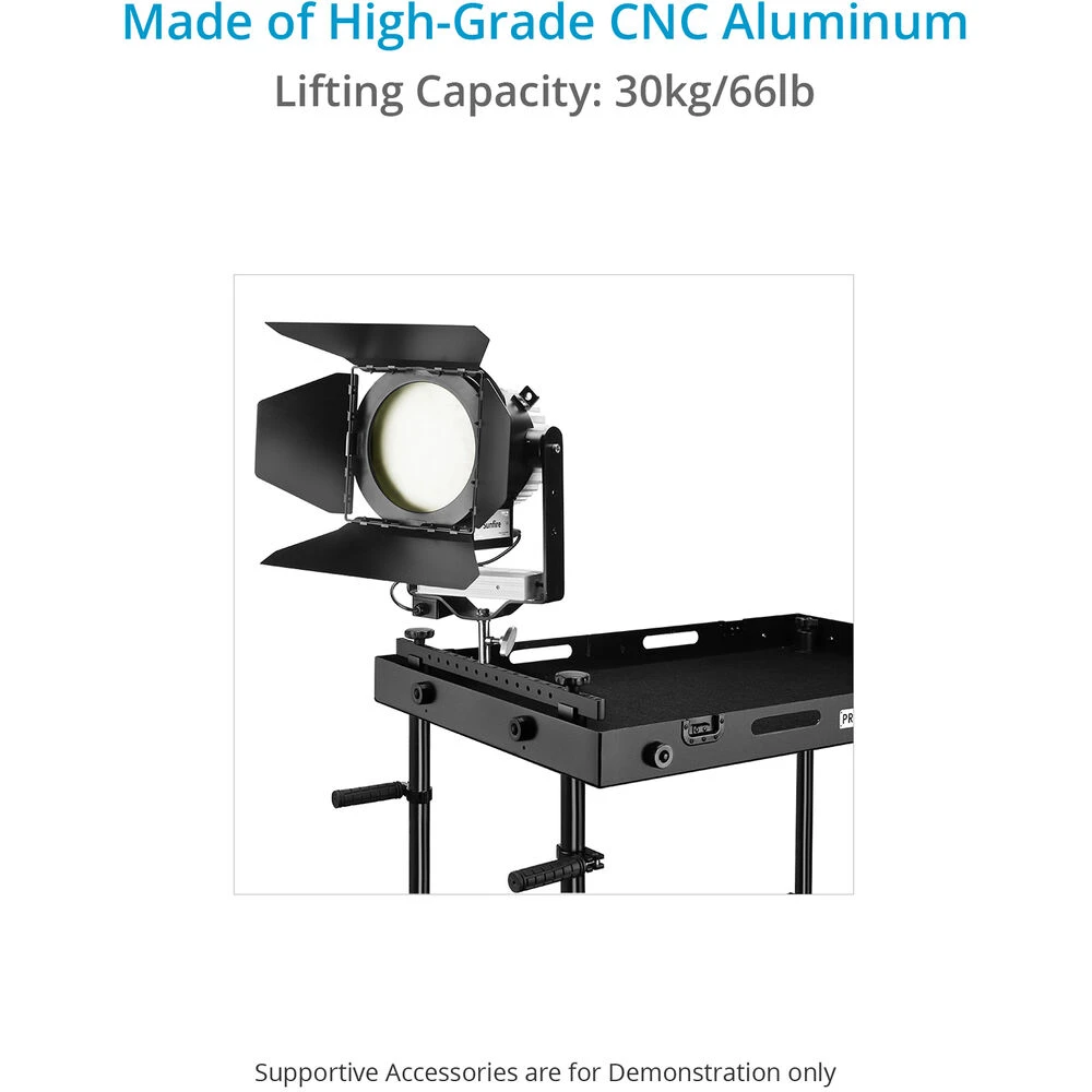 Enhance the versatility of your Victor Lite Camera Cart with this Proaim Cheese Cross Bar, which offers you the most convenient and creative way to customize the cart. This long crossbar mounts on the top shelf at the narrow side of the cart and gives it incredible accessory mounting flexibility. It is made of high-grade CNC aluminum and offers a lifting capacity of up to 66 lb. It has multiple 3/8″-16 threaded holes for mounting various photo/video accessories to provide ongoing support for your production.
