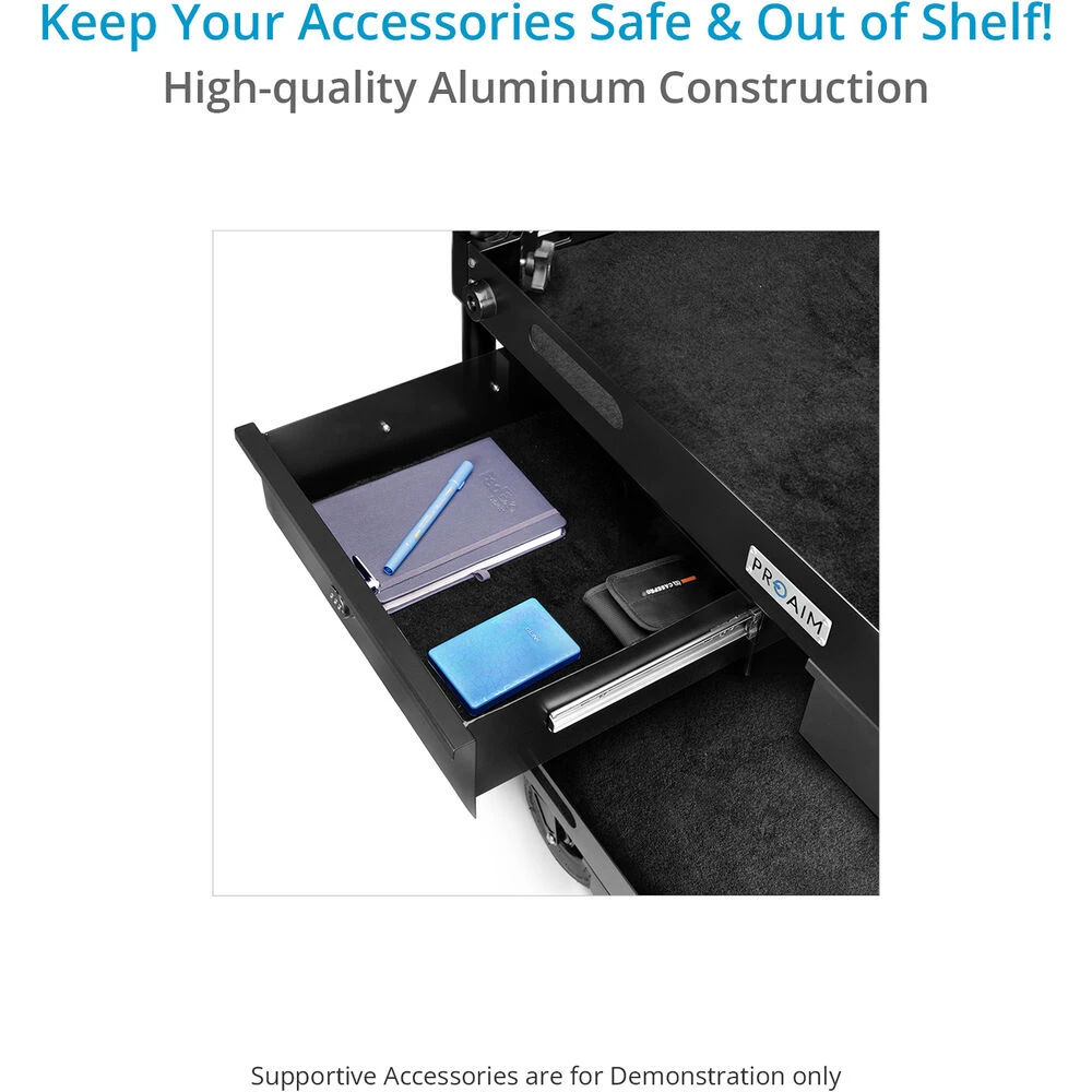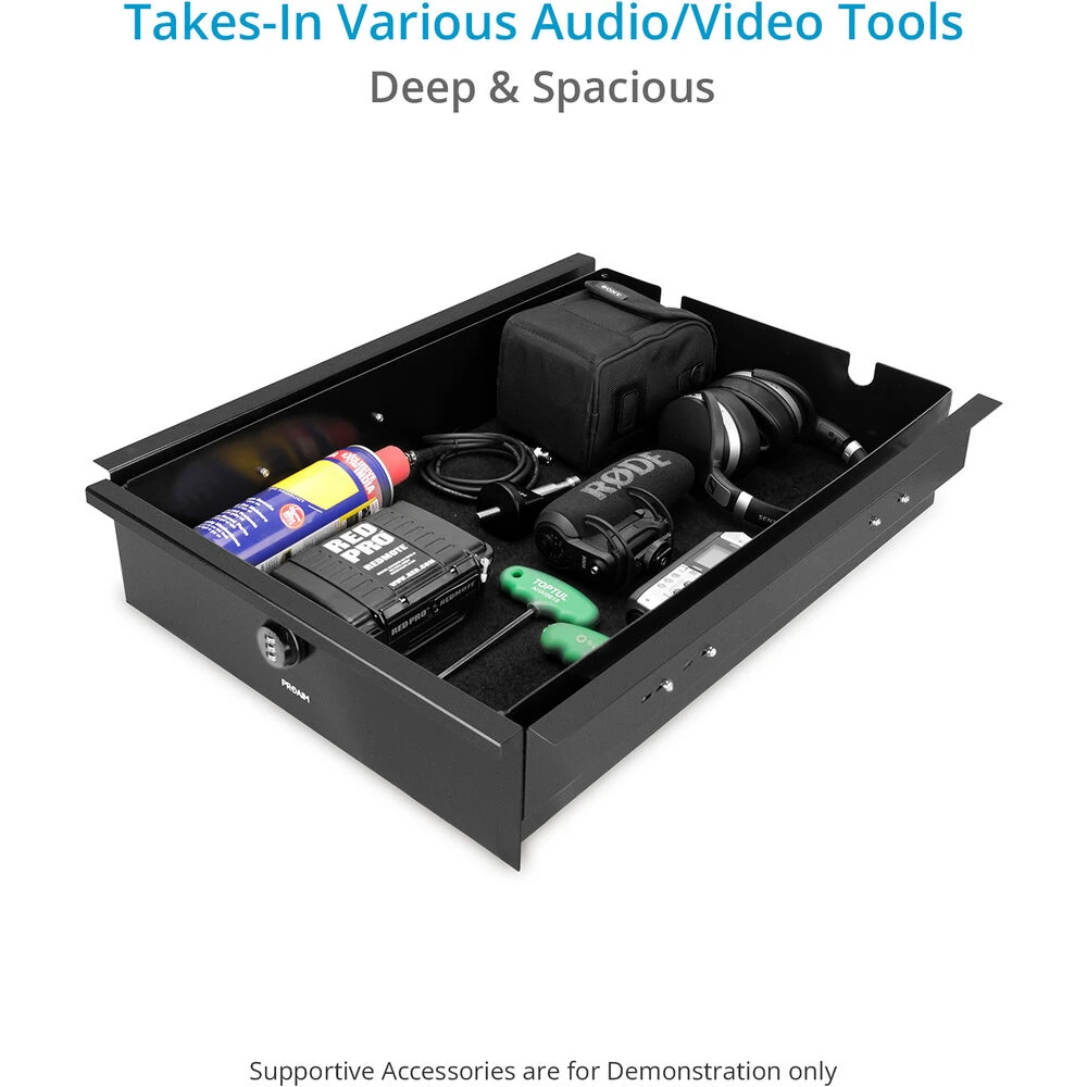 The Proaim Smart-Lock Bottom Drawer for Soundchief Cart Workstation is a deep and fully enclosed drawer with an integrated combination lock to keep your gear secure. It not only carries your hard drives, camera accessories, cleaning supplies, and other quick-access tools, but also safeguards them.