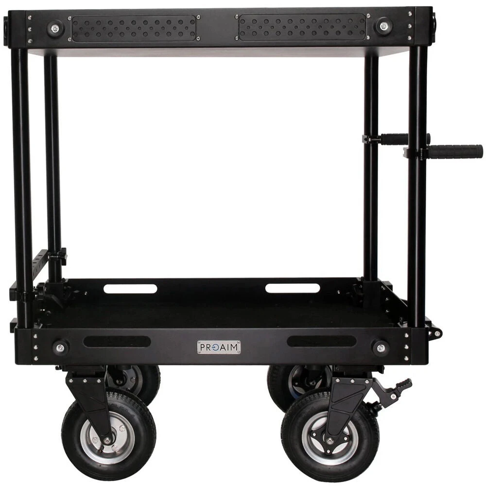 When the cart is set up for production, the height of the 32″ top shelf is adjustable along the vertical rods, just release the four locking knobs with no tools required. The higher you set the top shelf, the larger the equipment you can fit on the bottom one. Numerous optional supports from Proaim, for gear such as cameras, laptops, and monitors, can additionally be attached up and down the rods to expand your cart depending on the needs of the production, and a cheese-type mounting plate built into the top shelf supports yet more accessories. The push handles are height adjustable as well, also without any tools required. Besides allowing you to maneuver the cart, the handles let you lift the cart when you need to pass over curbs, steps, and similar obstacles. Integrated grip handles on the left and right sides of the bottom shelf provide a way for two people to fully lift the cart up to load it into a truck when it is in assembled form.