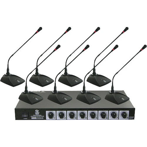 The Pyle Pro PDWM8300 VHF Wireless Conference Microphone System is sold complete with 8 wireless table-top microphones, and an 8-channel wireless receiver with mixed output on mono XLR and 1/4″ outputs. The PDW8300 is a cost-effective and efficient system that operates over the VHF frequency band, eliminating the need for obtrusive cabling. There are 8 individual microphone level controls, 8 audio outputs and a stereo mixed audio output. Setup is quick and the system is easy to operate, making the PDWM8300 a viable solution for conferences, board meetings, and more.