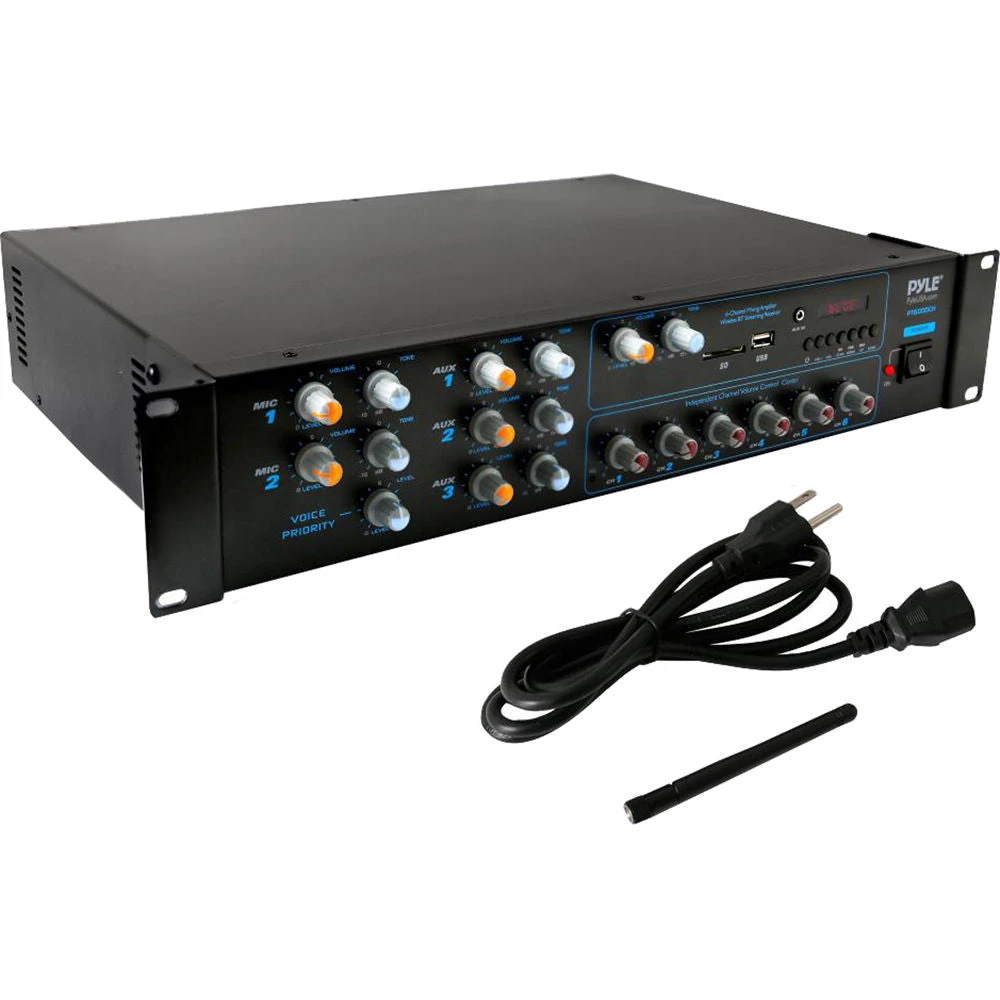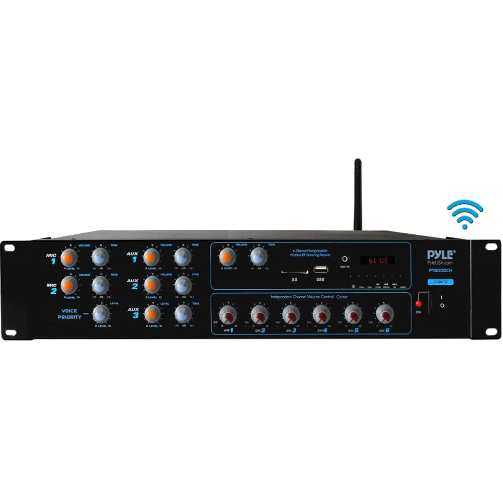 Enjoy music from your wired and Bluetooth-capable devices with the Pyle Pro PT6000CH 6-Channel Receiver . This receiver produces up to 4200W of RMS power and is equipped with Bluetooth connectivity, allowing you to wirelessly stream music from compatible audio sources such as computers, smartphones, and tablets. With six speaker outputs, you can have music playing throughout your store of office. A USB reader and SD card slot are also onboard, along with three stereo RCA inputs, a 3.5mm aux input, and two 1/4″ microphone inputs. The integrated FM tuner allows you to enjoy free over-the-air content and store up to 30 stations.