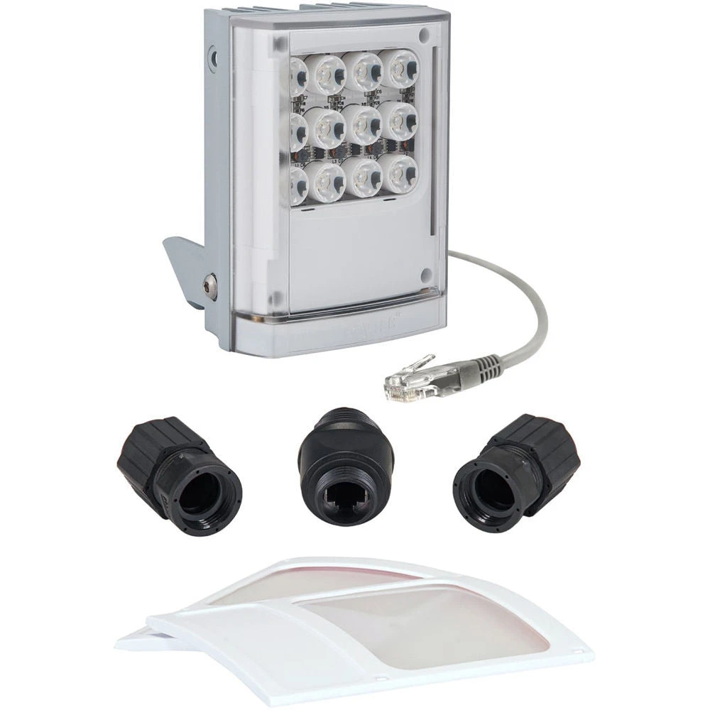 The silver VAR2-POE-w4-1 Medium-Range White-Light PoE Illuminator from Raytec uses PLATINUM Elite SMT LED technology to achieve operating distances of up to 361′. It features an interchangeable lens system with HRT to deliver even illumination without overexposed white spots. It comes with three lenses, including a 10 x 10° circular, a 35 x 10°, and a 60 x 25° lens to fit your needs. The unit is IP66-rated for protection from dust and water, making it suitable for outdoor use.