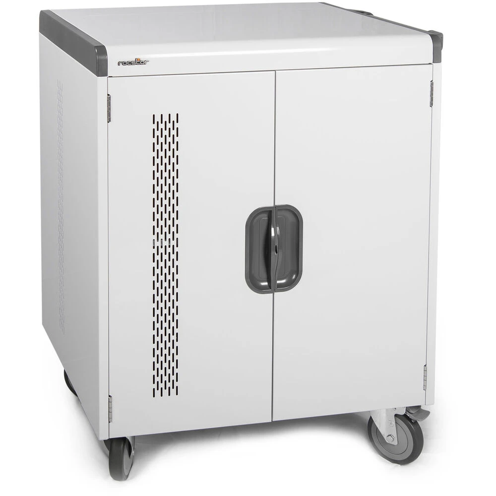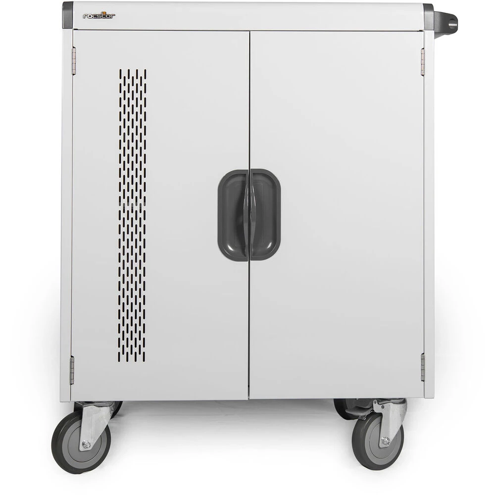 Charge and store your tablet and laptop computers with the 100W VOLT V32 Smart Charging Cart by Rocstor. This charging cart holds and charges up to 32 tablets or laptops up to 16″. Intelligent charging directs power so each device charges as quickly as possible. Secure your technology with the two front pad-lockable doors and two rear pad-lockable access panels. Keep your computers cool with built-in ventilation fans. The cart stays mobile thanks to four 5″ casters, two of which are rigid and two of which swivel 360°. Built-in cable management keeps your setup neat and clean. The unit ships fully assembled.