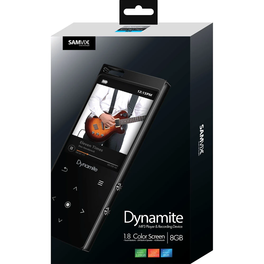 The stylish black-colored Dynamite 8GB Sport MP3 Player from Samvix features a metallic body, 1.8″ color display and intuitive touch controls. Listen to music and other audio files from its 8GB of built-in storage, which can be expanded up to 64GB with an optional SD card. Samvix gives you three ways to enjoy your content. Listen through the built-in speaker, use the included earphones, or pair an optional Bluetooth headset for wireless playback. You can also use the storage with the integrated microphone to take notes and other recordings.