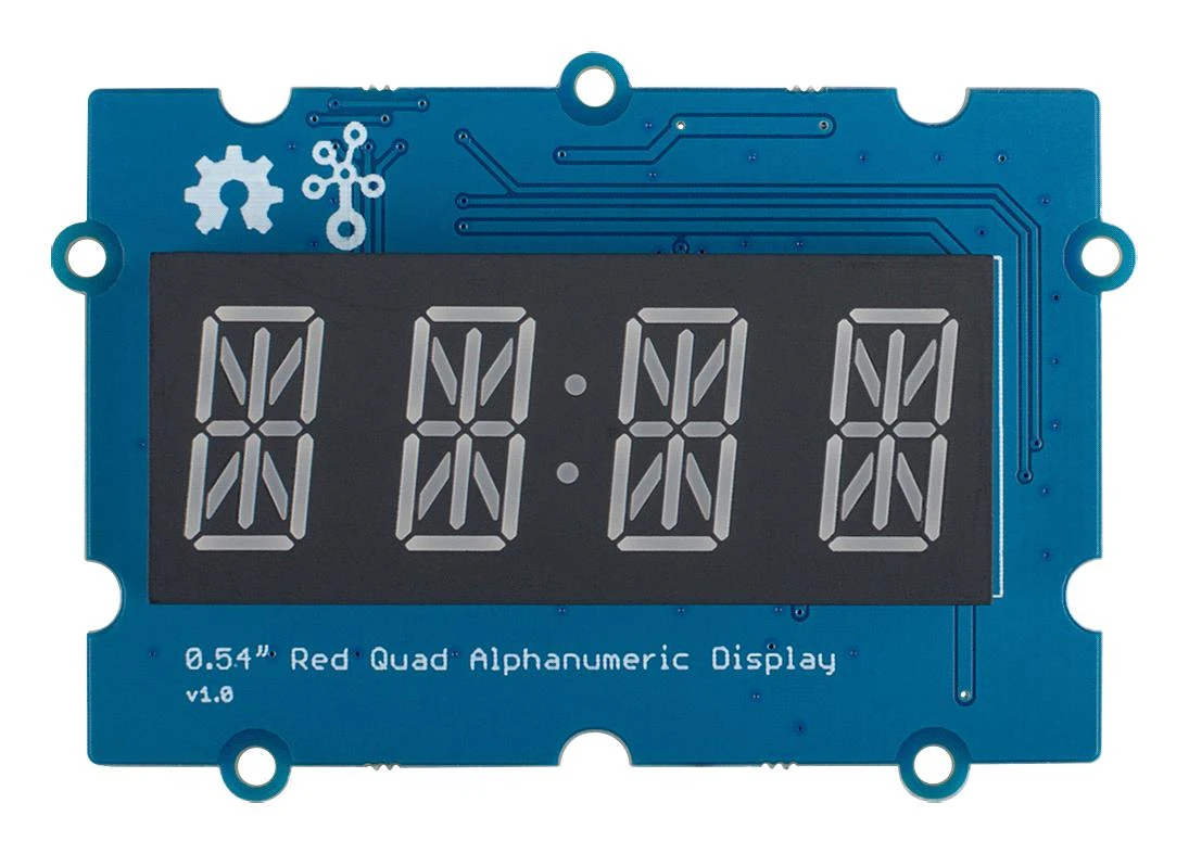 Grove -13.71mm Red Quad Alphanumeric Display module is a 4 digit alphanumeric display with high brightness and red backlight, each digit is consists of a 14-segment digital tube.