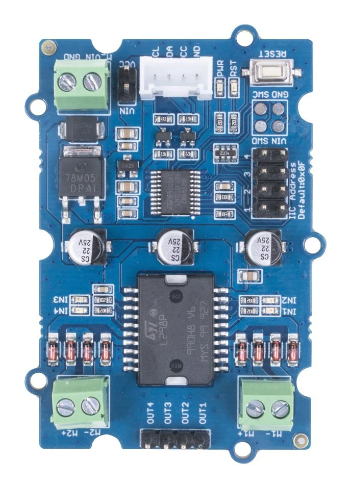 Grove – I2C Motor Driver(L298P) is a common-use motor driver for stepping motor and servo motor. It embeds an STM32 chip for burning the code to control the motor driver. This is a 2-channel motor driver, each channel can support up to 1A current. You can also use the I2C interface to transmit data from the peripheral microcontroller.