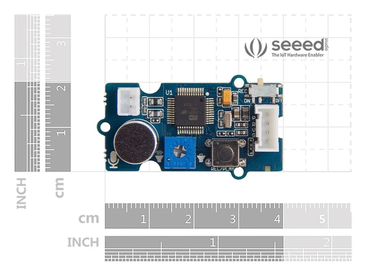 Grove – Recorder v3.0 is a latest version of grove-recorder. In V3.0, the MCU is upgraded from to be ISD9160FI, which is more powerful than the old one ISD1820PY. It is integrated the record summary and play back summary in to one summary. By holding the summary for 2 sec, it starts recording, by push the summary quickly, it plays back what has been recorded.