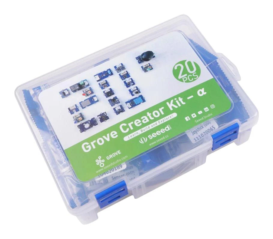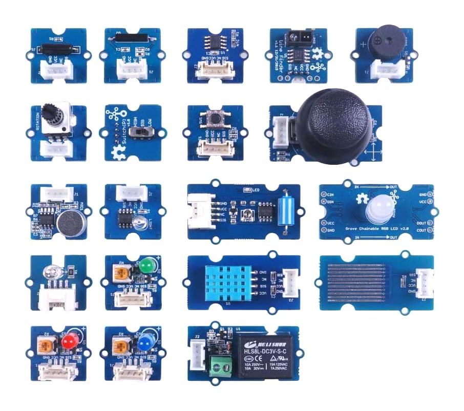 Buzzer x 1, Vibration motor x 1, Tilt switch x 1, Rotary angle sensor x 1, Magnetic switch x 1, Thumb joystick x 1, Switch x 1, Button x 1, Green LED x 1, RGB LED V2.0 x 1, Multi colour flash LED x 1, Red LED x 1, Blue LED x 1, Temperature sensor x 1, Water sensor x 1, Sound sensor x 1, Light sensor v1.2 x 1, Line finder v1.1 x 1, Rotary angle sensor x 1, DHT11 x 1, Universal 4 pin 20cm unbuckled cable x 5, Branch cable 20cm x 1, 4 pin male&female jumper to 4 pin conversion cable 20cm x 4.