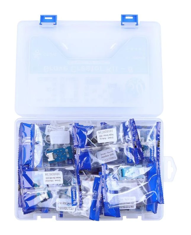 Buzzer x 1, LCD x 1, Wireless IR emitter x 1, IR receiver x 1, Vibration motor x 1, Tilt switch x 1, Rotary sensor x 1, Magnetic switch x 1, Thumb joystick x 1, Switch x 1, Button x 6, LED x 4, Temperature sensor x 1, Water sensor x 1, Sound sensor x 1, Light sensor x 1, Line finder x 1, Rotary angle sensor x 1, DHT11 x 1, Loudness sensor x1, Ultrasonic ranger x1, Universal 4 pin 20cm unbuckled cable x 10, Branch cable 20cm x 1, 4 pin male&female jumper to 4 pin conversion cable 20cm x 8.