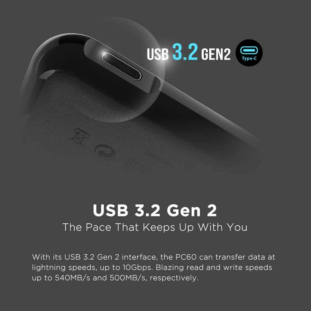 Access your data from anywhere using the portable 4TB PC60 Portable External SSD from Silicon Power. With up to 540 MB/s read speeds and 500 MB/s write speeds as well as 10 Gb/s transfer speeds through the host USB-C 3.2 Gen 2 connection, this drive offers robust speeds for creators on the go. Connect the PC60 to your device using the included USB-C to USB-A cable and USB-A to USB-C adapter.