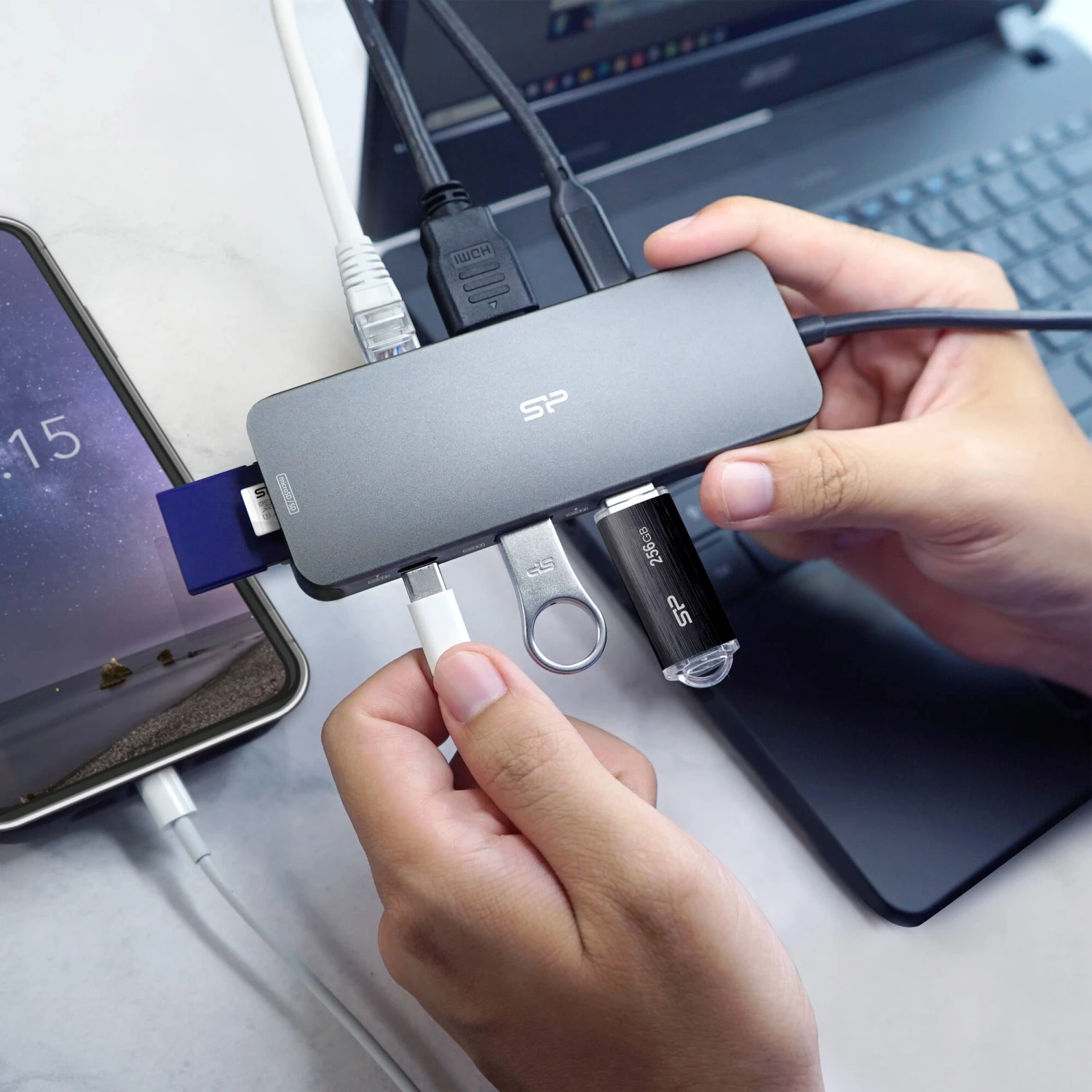 Enhance productivity and expand your workstation using the Silicon Power SR30 8-in-1 Docking Station. The SR30 8-in-1 uses a USB-C 3.2 Gen 1 host connection and offers a multitude of USB ports, two card slots, and an HDMI port for peripherals, storage, and external displays. The portable design and aluminum build makes for a durable solution for those who work on-the-go or alternate between home and office. This docking station is compatible with iPhone, Mac, iPad, Chromebook, and PC.