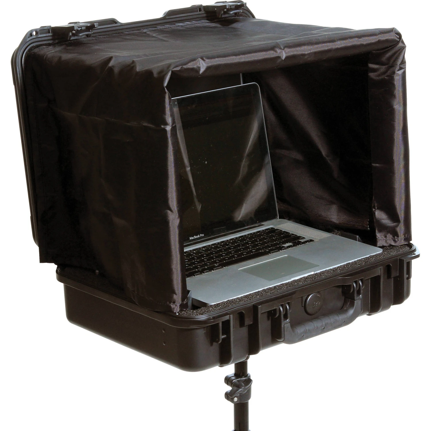 The case is designed to fit most 17″ laptops, and includes a sun screen that is stored in the lid at the base. An accessory compartment is located beneath the base for accommodating a power supply or an external hard drive. The sun screen includes a collapsible frame for secure storage. The bottom of the case is reinforced by a heavy-duty metal plate, and features a built in 3/8� female thread. Any light stand, tripod, or mic stand (sold separately) that can handle the weight of the laptop, case, and other accessories will work to support the case.