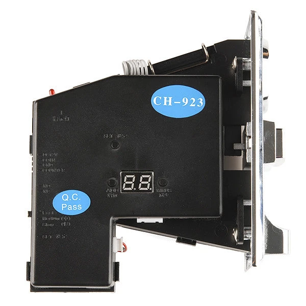 The sensors in this coin acceptor use the thickness, diameter and fall time of the coins to identify them and it’s fully programmable so you’re not limited to any particular type of currency. Simply use the summarys and 7-segment display on the side of the unit to select a coin profile, insert a bunch of coin samples (or the same one, over and over) and you’re good to go! After you’ve programmed the coin profiles, the coin acceptor will recognize them and report when each type is inserted, rejecting other coins.