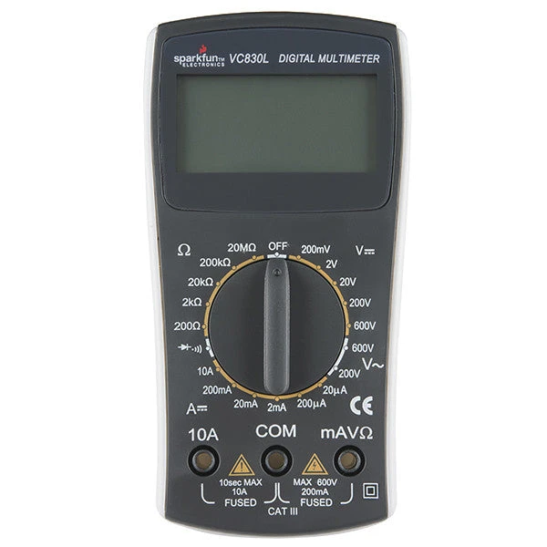 The digital multimeter (DMM) is an essential tool in every electronic enthusiasts arsenal. The SparkFun Digital Multimeter, however, is not your average multimeter, it features a loud continuity sound, current/voltage sense, and quality probes. You can use the multimeter to measure DC and AC voltage, DC current, resistance, continuity, and test diodes. With this version we’ve done away with the bright flashy colors that can get us into trouble and gone with a nice, neutral gray. This multimeter should provoke no strong feelings one way or the other, we know this because our guts say “maybe.”