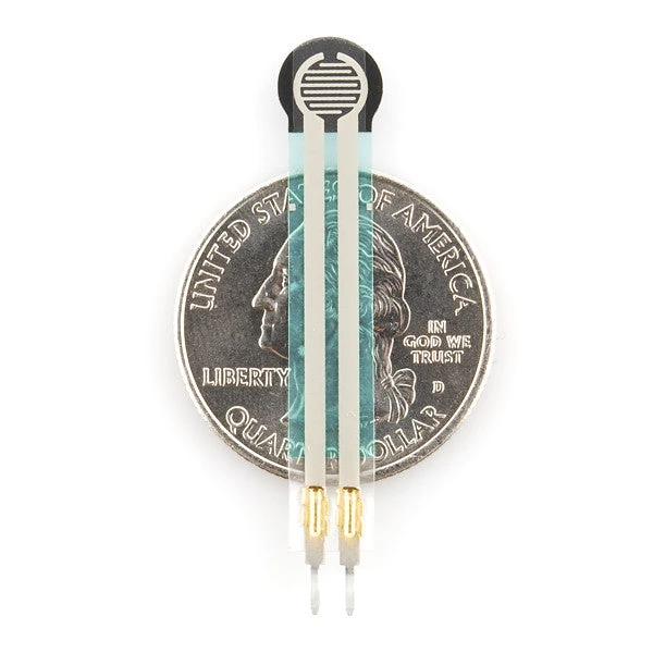 This is a small force sensitive resistor. It has a 0.16″ (4 mm) diameter active sensing area. This FSR from Interlink Electronics will vary its resistance depending on how much pressure is being applied to the sensing area. The harder the force, the lower the resistance. When no pressure is being applied to the FSR, its resistance will be larger than 1M?, with full pressure applied the resistance will be 2.5k?.