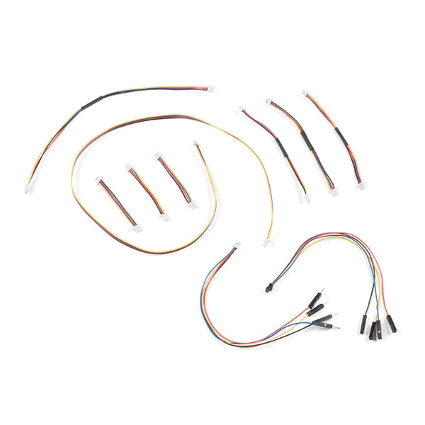 The SparkFun Qwiic Cable Kit includes 10 cables of various lengths and styles that will get your Qwiic boards connected together, to a development platform, or to a breadboard. Each Qwiic Cable’s wires have been color coded to red, black, blue and yellow with 1mm JST termination.