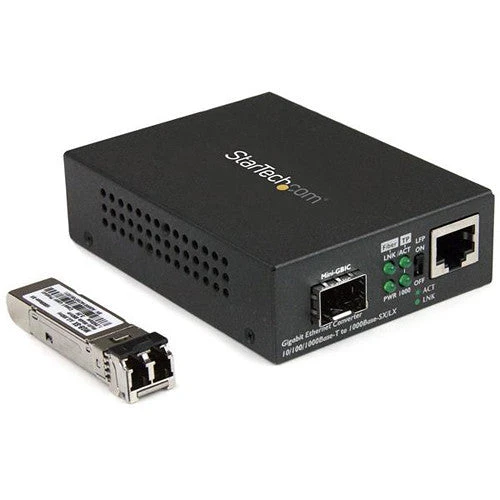 Extend your Gigabit Ethernet connection over long distances with the Gigabit Ethernet Fiber Media Converter from StarTech . This device converts Gigabit Ethernet signals to optical signals to extend a network connection over a fiber backbone. It’s equipped with a multi-mode transceiver and operates on an 850 nm wavelength for distances up to 1804′ (550 m). Enclosed in a metal housing, this device ensures reliable performance and scalability between distant locations. It also features auto MDIX, support for 9K jumbo frame, and Link Fault Pass (LFP). Installation is easy as it’s a plug-and-play device. Once it’s set up, you can mount it in a variety of options and monitor it using its LED indicators.