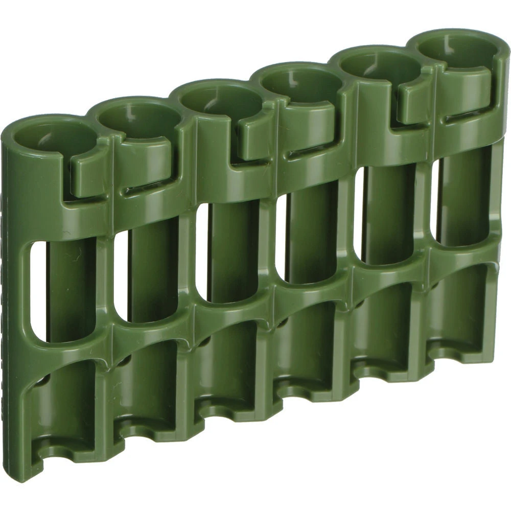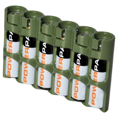 The military green Storacell SlimLine AAA Battery Holder is an organizer designed to accommodate up to 6 AAA batteries. Its design permits one-handed dispensing of batteries. The caddy protects both terminal ends of each inserted battery, regardless of orientation.