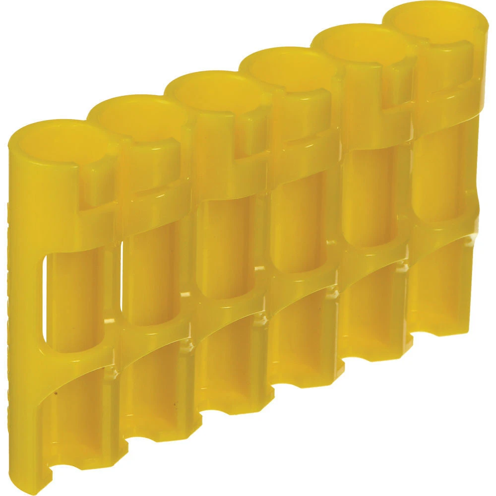 The yellow Storacell SlimLine AAA Battery Holder is an organizer designed to accommodate up to 6 AAA batteries. Its design permits one-handed dispensing of batteries. The caddy protects both terminal ends of each inserted battery, regardless of orientation.