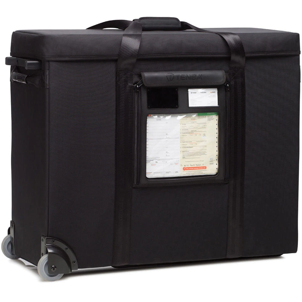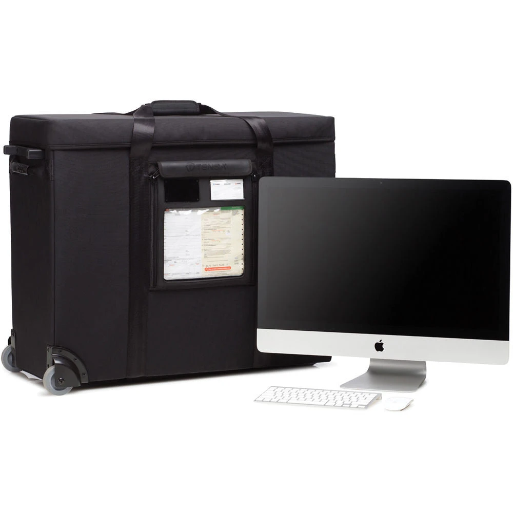 The black Tenba 27″ Apple iMac Air Case with Wheels is designed to carry, ship and protect a late 2012, thin model Apple 27″ iMac desk computer with keyboard, mouse and cables. The case is built to meet or exceed ATA shipping standards. The Air Case construction comprises a multi-layered skeleton of air-channeled plastic panels, high-density foam, and specially-molded framing components, with a heavily reinforced ballistic nylon outer shell. They are strong enough to stand on, even when empty. It has wide, unrestricted openings that provide fast, easy access to the contents. There is a Datapanel that integrates a shipping document window, a business card holder, and an engravable metal I.D. plate. The air case is transported by a carry handle and a heavy-duty 2-wheel assembly.