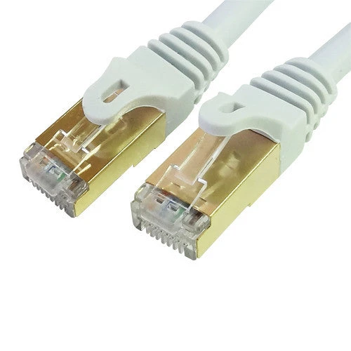 The white Premium Cat7 Double-Shielded 10 Gigabit 600 MHz Ethernet Cable from Tera Grand is 50 long and rated for transmission frequencies up to 600 MHz, making it suitable for 10 Gigabit Ethernet environments. Tera Grand has shielded each pair of wires with aluminum Mylar foil and then bundled these pairs with an 85% tinned copper braid to improve noise resistance, as well as almost completely eliminate alien crosstalk (AXT). Moreover, the RJ45 connectors have 50 micron of gold plating for protection against EMI/RFI interference.