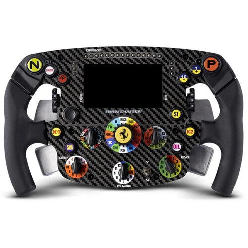 Officially licensed by Ferrari, this Thrustmaster Add-On Formula Wheel is a 1:1 scale replica of the wheel from the legendary Ferrari SF1000 single-seater racecar. Just like the real wheel, this Thrustmaster wheel features the same iconic labeling and official markings. The wheel also features a 4.3″ IPS display showing up to 69 items of racing information. The display can be natively connected or connected via wireless telemetry (Wi-Fi). The race dash also features different skins to match the type of game you are playing or car you’re driving. There are 21 LEDs, including 15 for the engine speed and 2×3 for the race marshal flags. The wheel’s faceplate is 100% carbon fiber, which provides balanced Force Feedback. The textured rubber grips allow for precise racing. With up to 25 action summarys, you’ll have total immersion in your racing sim. The seven encoders located near your thumbs, the display, and the bottom of the wheel make it easy to assign controls, and allow for intuitive in-game adjustment of settings. Made of 100% aluminum, the paddle shifters feature push-pull technology. The magnetic paddle shifters allow for clear, precise activation to avoid driving errors while also providing durability. You can also switch the paddle shifters out with the Thrustmaster T-Chrono Paddles (sold separately).