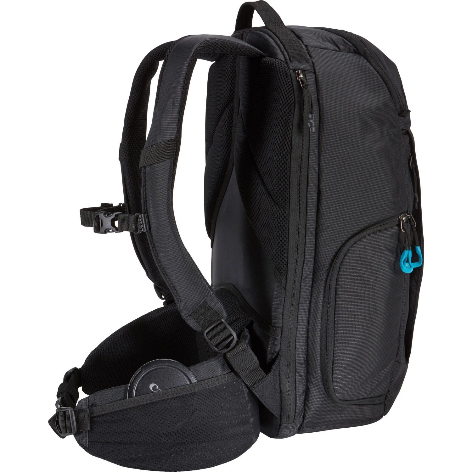 Store and protect your DSLR camera, laptop, tablet, and necessary accessories in this padded, black Aspect DSLR Backpack from Thule . A customizable spacious main compartment can easily hold your DSLR camera body and a combination of lenses, flash, and other equipment while a designated rear zippered compartment can fit a laptop up to 15.6″ and an iPad or similar sized tablet. Multiple pockets throughout the interior and exterior of the bag can help you organize your gear. You can store your tripod in one of the side storage panels while spare batteries and memory cards or a small wallet can be tucked into the zippered hip belt pockets.