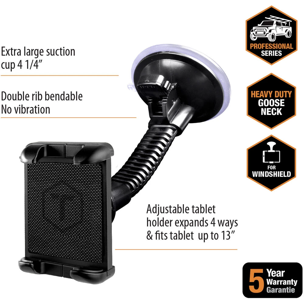 The Mammoth Mount Holder from ToughTested securely holds tablets and GPS units up to 13″. It expands four ways using retractable grips on each edge, allowing your device to be positioned horizontally or vertically. The mount also rotates 360° and the flexible arm that can be placed in multiple positions. Using the integrated heavy duty suction cup, this mount holder adheres to glass or the windshield of your car, where it helps reduce vibrations and keep things steady.