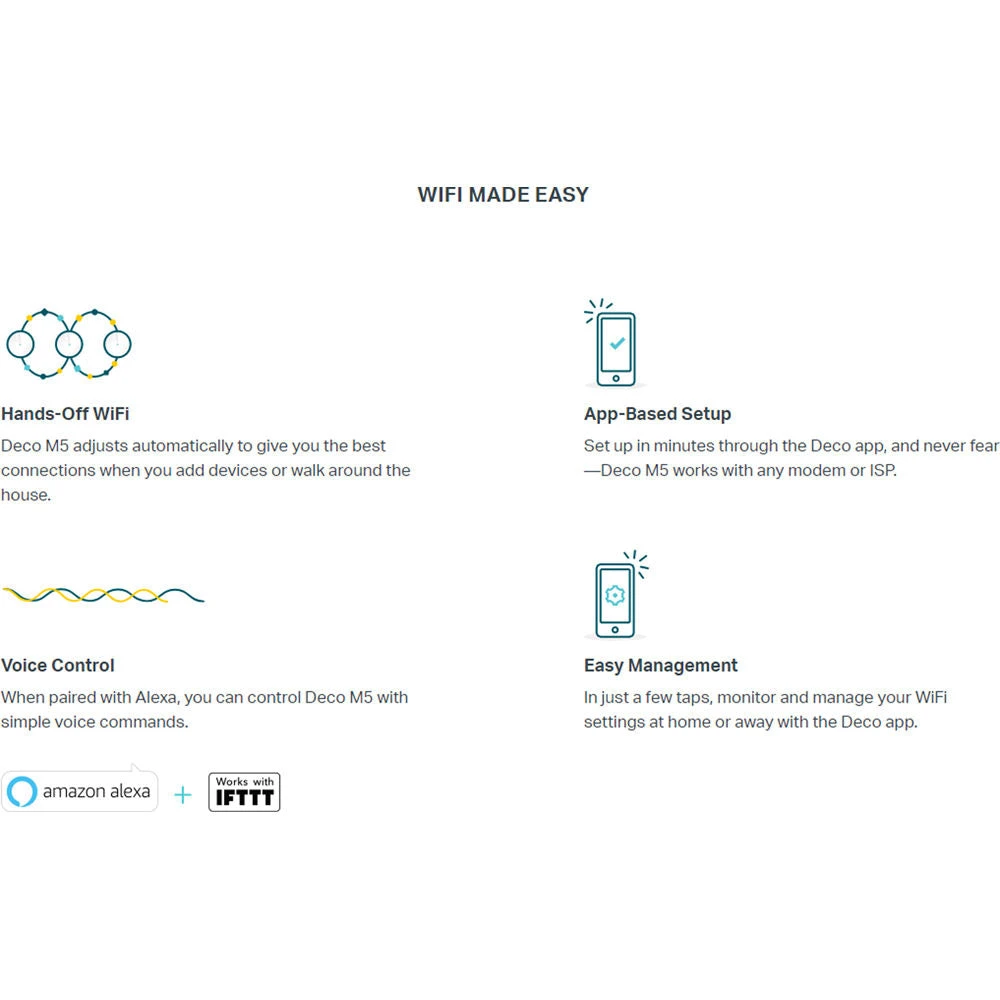 Immerse your entire home in seamless Wi-Fi with the Deco M5 AC1300 MU-MIMO Dual-Band Whole Home Wi-Fi System from TP-Link . This mesh networking Wi-Fi system is designed to provide enhanced Wi-Fi coverage of up to 3800 square feet. The Deco M5 can support a total of 9 units, making it possible to cover large areas while providing Wi-Fi to multiple users simultaneously. Setup, configuration, and management of the Deco M5 Wi-Fi system is simple and can be accomplished using the Deco app, available for iOS and Android based mobile devices.