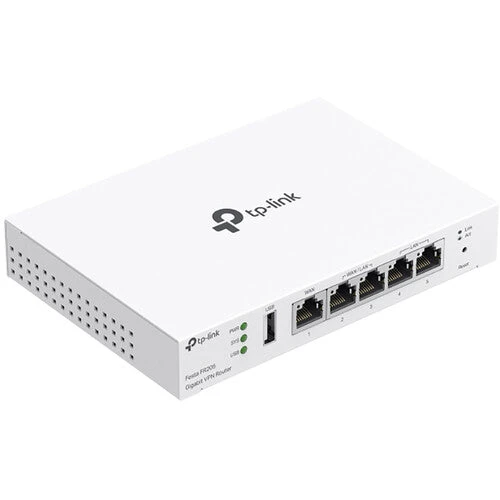 Designed for small businesses, the Festa FR205 Gigabit VPN Router from TP-Link helps to protect your network while providing easy configuration and management of connected devices. This VPN router features five Gigabit Ethernet ports, two of which can be freely switched between WAN and LAN modes and work alongside the dedicated WAN and two LAN ports to manage multiple internet connections through one device.
