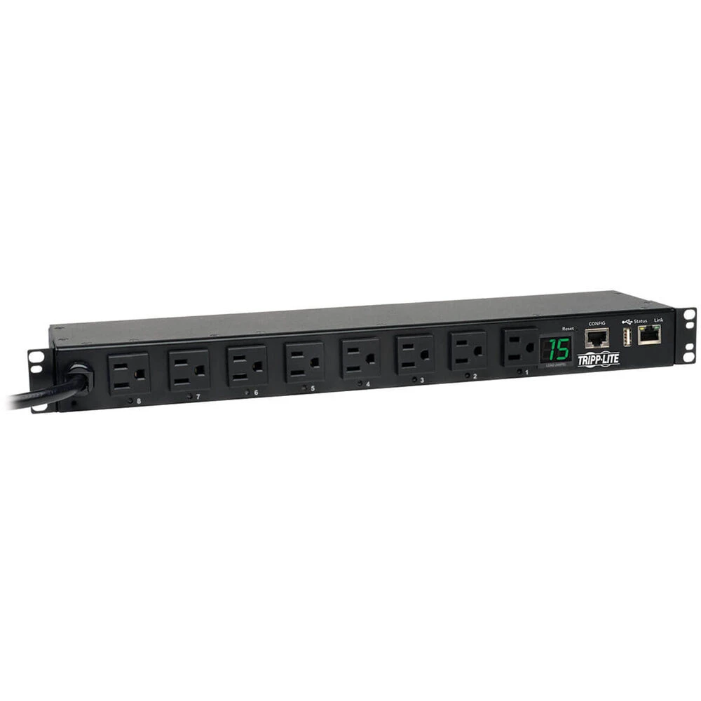 The Tripp Lite 8-Outlet 1400W Single-Phase Switched PDU distributes, monitors and manages AC power in an IT environment. The built-in Java-free network interface helps you remotely monitor load levels to prevent overloads that cause downtime. This PDU is compatible with 120V inputs and connects via an integrated 12′ AC power cable using a NEMA 5-15P plug.