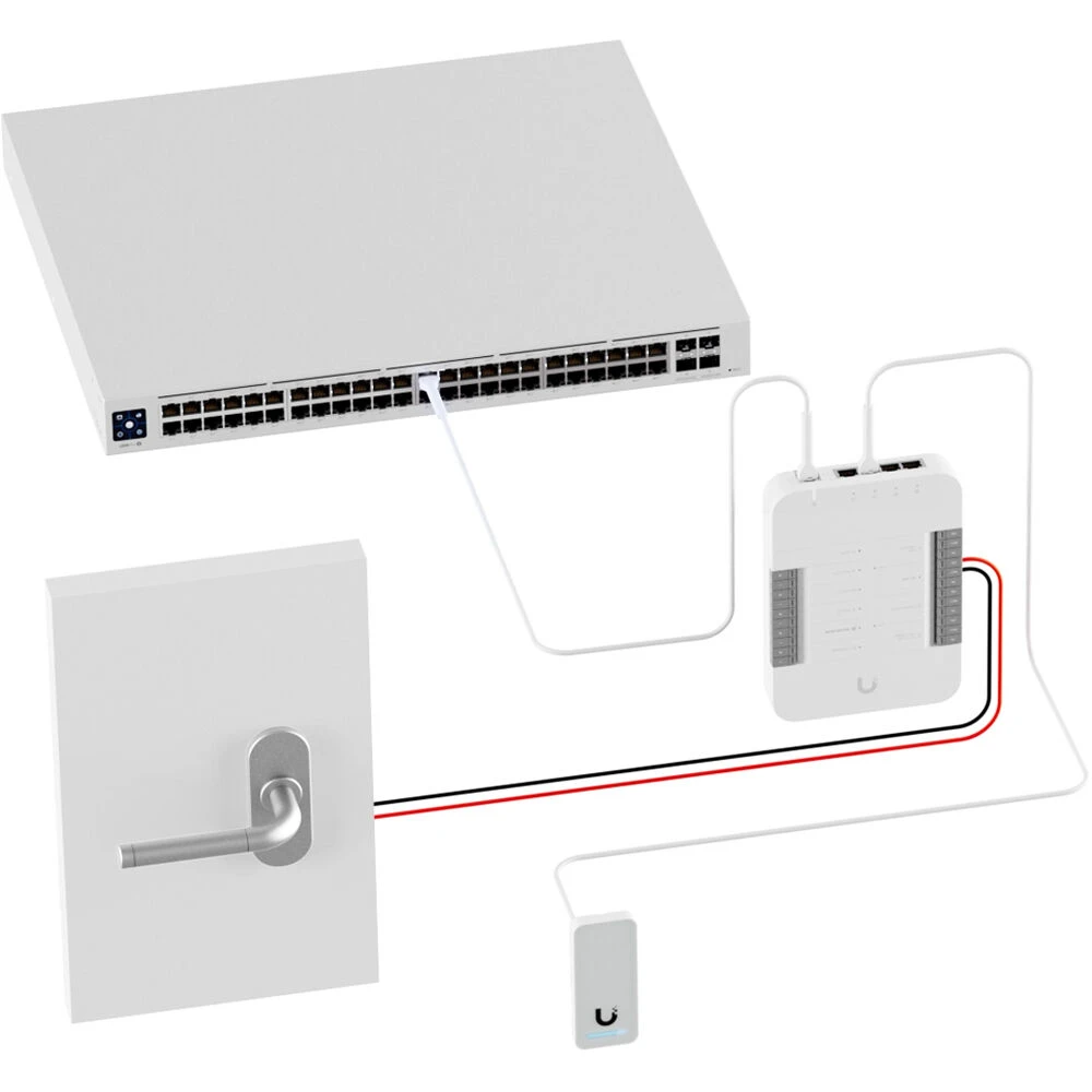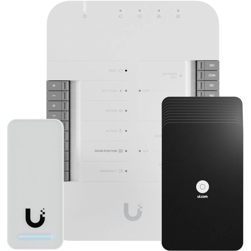 The UniFi Access G2 Starter Kit from Ubiquiti Networks includes a UniFi Access Hub, a UniFi G2 Reader, and ten access cards for an access control, security, and authentication solution.