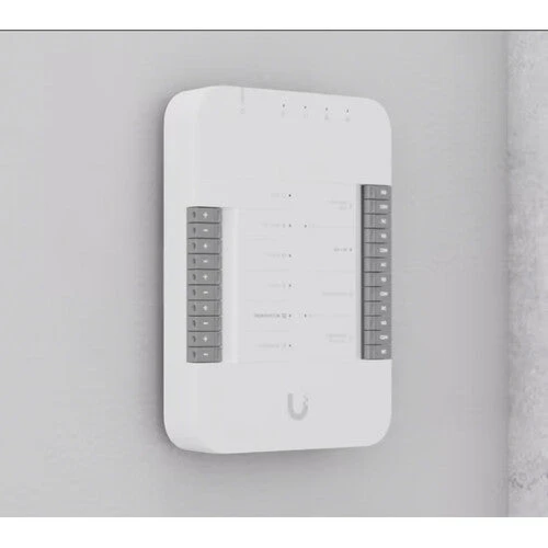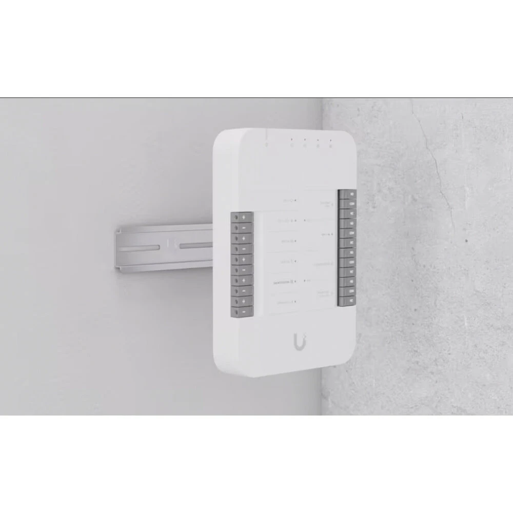 Implement access control, security, and authentication at an entryway with the DIN-rail mountable UniFi Access Hub from Ubiquiti Networks. This unit is a networked single door controller powered by an 802.3bt PoE++ switch. Input relays on this hub support request-to-exit, request-to-enter, door position switch, and remote release devices. Additionally, the hub’s 12V powered and dry output relays are compatible with most locks. Management of this device is via the UniFi Access Controller software.