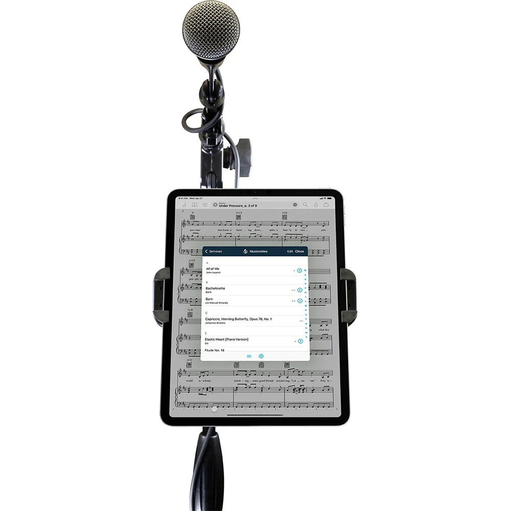 The Ultimate Support UTH-100 Universal Tablet Holder has a clamp that extends to 9″ and an arm length of 7.75″. It uses a two-approach design to reliably support a wide variety of current tablets. The included mic stand clamp allows this sturdy support design to easily attach common tablet models to mic stands for on-stage and in-studio use. Thanks to the unique support arms that flex to cradle your tablet, this device can now be used with large tablets as well, while the wide range of movement available to the arms allows them to be adjusted for a variety of scenarios