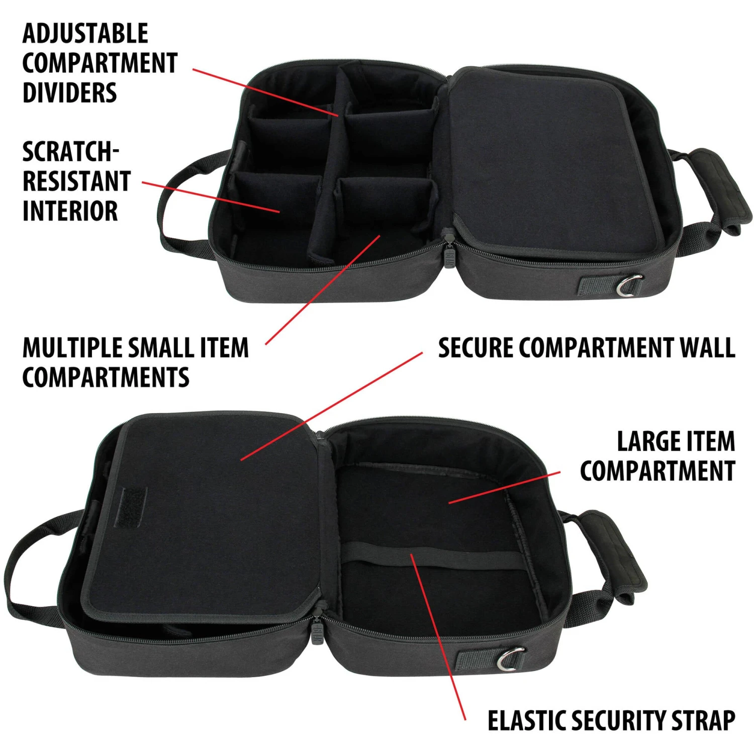 The USA GEAR S14 Travel Case supports various gear/devices along with their accessories. It measures about 12 x 9 x 6″ (exterior) and offers divided compartments in both the top and bottom sections for securely storing your equipment. The case is designed to store/transport your devices while protecting them from daily wear and tear. It’s made with durable nylon material and has a reinforced weatherproof base and padded scratch-resistant interior.