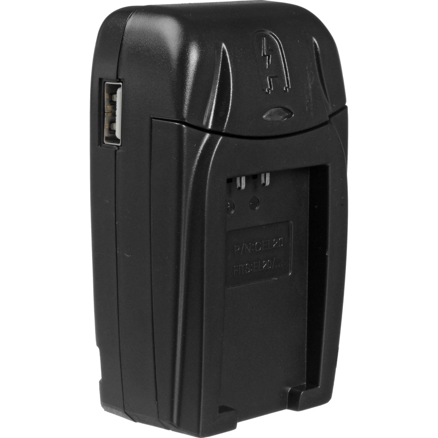 The Compact AC/DC Charger features a USB power output that allows you to charge & power MP3 players, phones, digital cameras, and other devices with a USB power input – even while charging your camera or camcorder batteries. With its easily interchangeable plate, the charger can also be used for other battery models – via the purchase of an additional battery adapter plate.