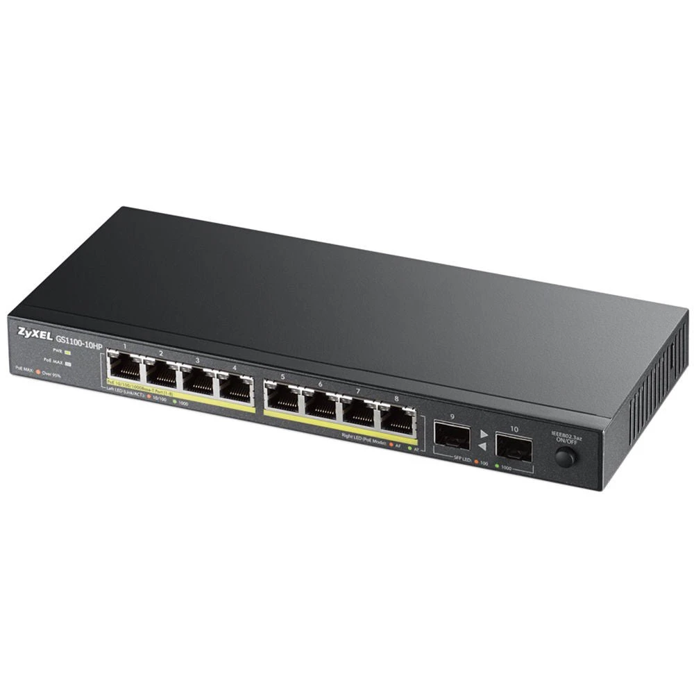 - The GS1100-10HP supports the PoE Plus standard to ease the installation of network devices in challenging spaces such as ceilings or walls. The low power supply per port allows the GS1100-10HP to power PoE-enabled WLAN APs, VoIP phones and IP surveillance cameras through cables without extra power adapters. This feature helps enterprises reduce installation time and cost when there are many such devices on the network. The GS1100-10HP has been designed with eight full PoE Plus ports, which makes it an ideal connectivity solution for high-density powered device deployments. In addition, the extra two SFP links on GS1100-10HP also easily extend networks to remote locations such as branch offices and warehouses for small- and medium-size businesses.